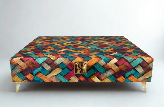 Caixa em MDF revestida em tecido tricoline digital. Parte interna revestida com veludo, porta anel e porta colar.